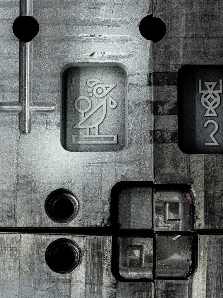 化石表面符号蚀刻0.3mm,碳素色填充,光线反射率79%,边缘机械工整,初步判定为硅基时代产物。